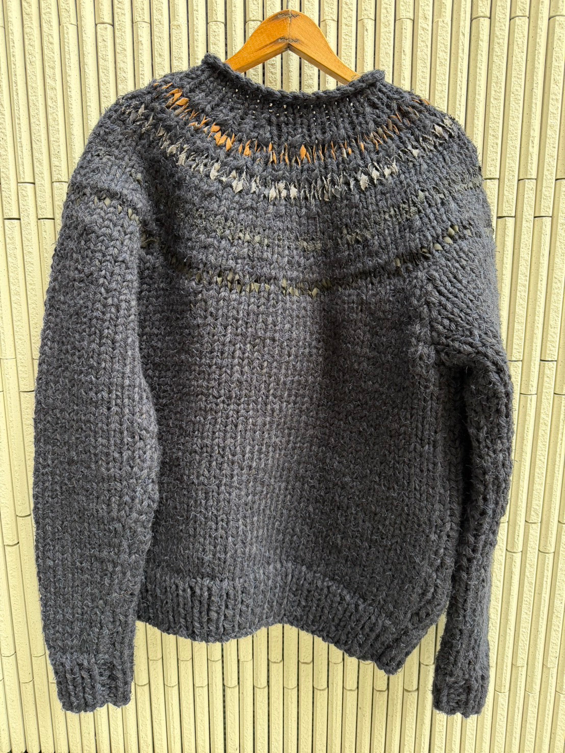 1年前の襟なしカウチンタイプで度目を詰めてガシッとした迫力ある仕上がりの手編みです。今回もファスナーに糸が噛まないよう特別な処置で対応させていただきます。サイドにポケットが付いております。