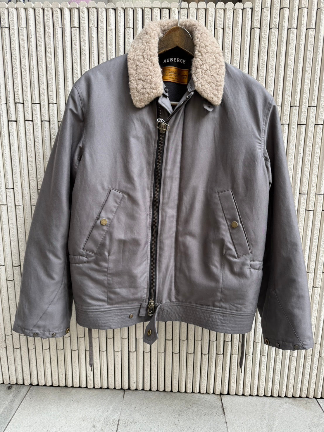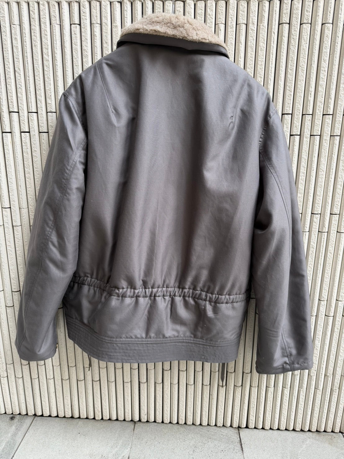 60年代のフランス軍フライトジャケットをベースにデザインしました。オリジナルのコットン生地やファスナーポジションなどから明らかにアメリカ空軍のB15シリーズを研究して作られた感がある1着である。古着のようなマッチョ感を極力薄め、着丈なども着やすく配慮いたしました。襟ボアはウールとヤクのミックスした素材を使用。結果、レギュラーサイジングで仕上がっております。